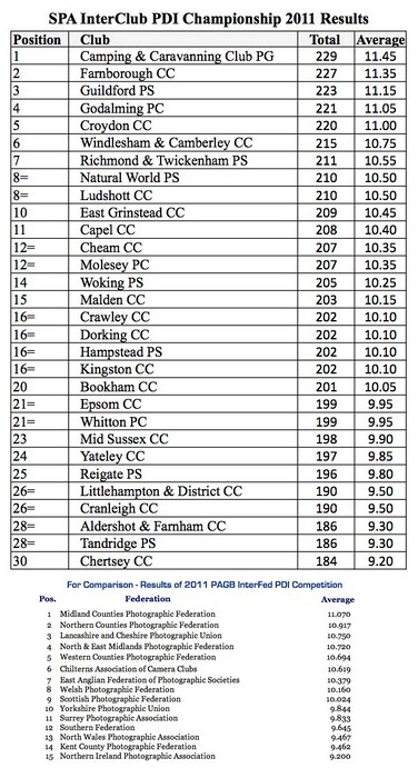 SPA InterClub PDI Championship Results The SPA Annual Projected Digital Image (PDI) Championships took the form of a 1 day event. The PDI Championship was run in conjunction with the SPA AGM in November 2011. |