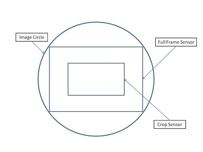 The diagram to the left shows the circular image that a lens creates. The larger rectangle represents a full size sensor that is the same size as 35mm film and which is just covered by the image circle. The smaller rectangle is a crop sensor and fits well within the image circle. |