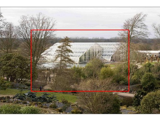 The area inside the red rectangle shows the view that would be captured if a lens of the same focal length were mounted on a camera with a crop sensor, where only the central part of the image would register. |