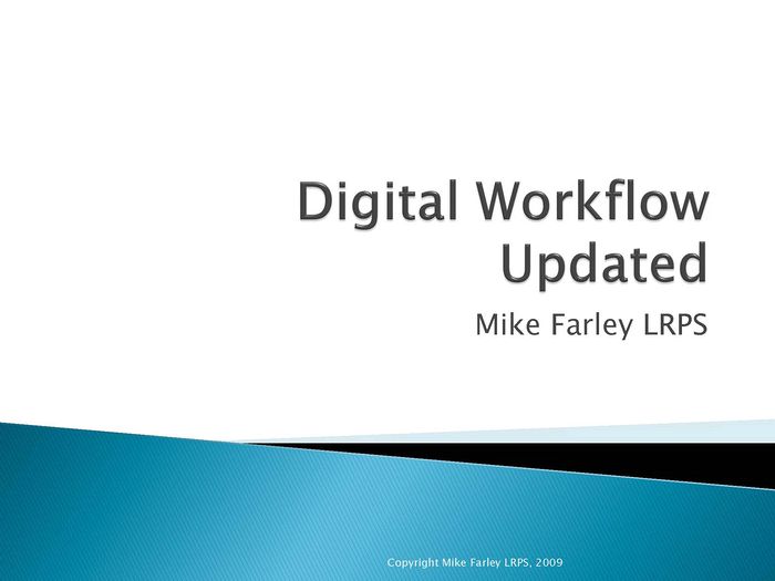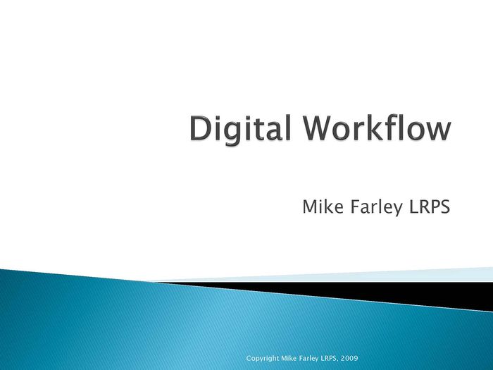 Digital Workflow is a presentation showing the key Photoshop steps to get the most from your images. There are many helpful descriptions on using RAW, Curves, filters and many other techniques, from initially retrieving the images from the camera throught to printing.